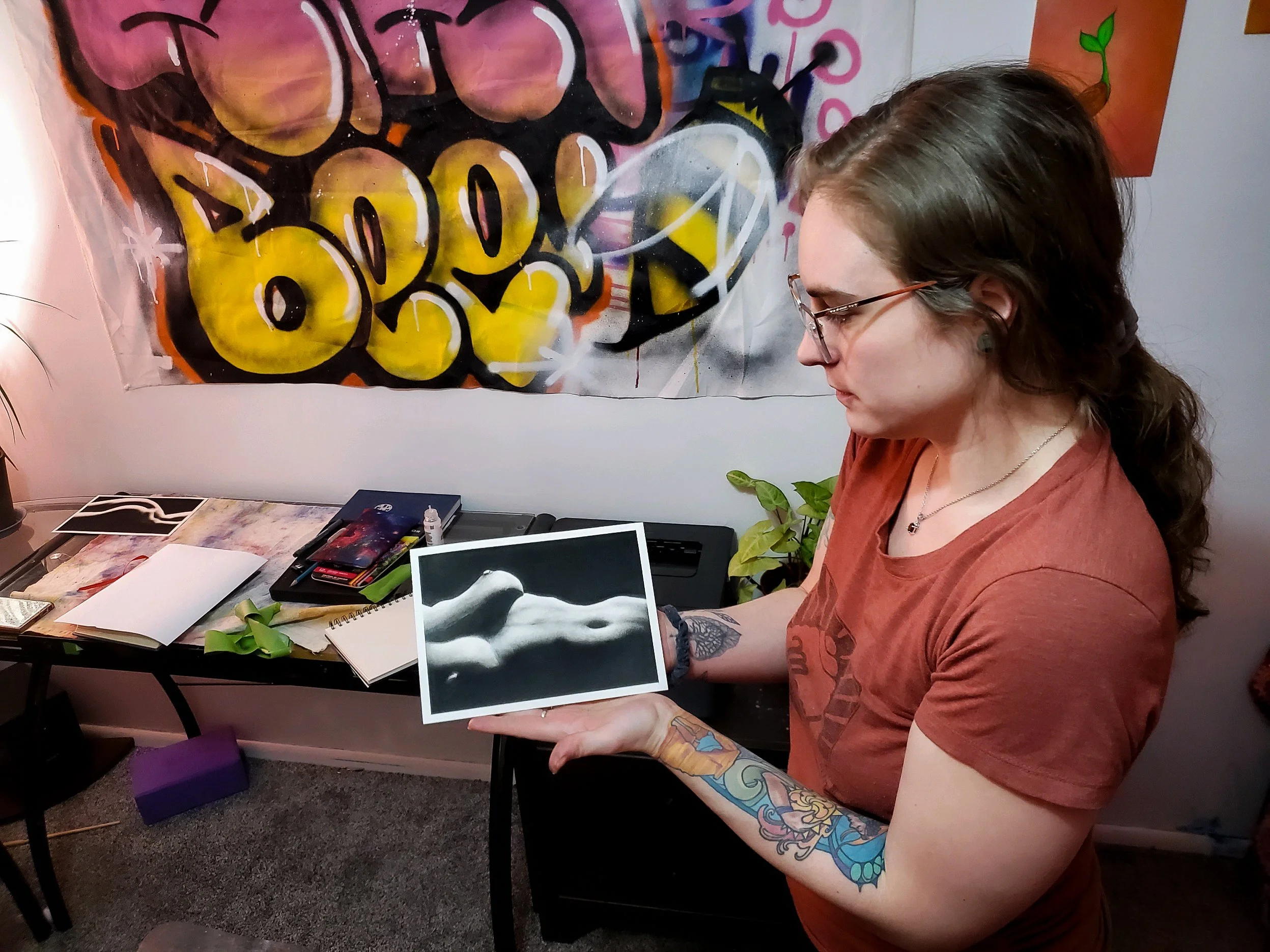 Her inspiration is drawn from nature, femininity, the cosmos, and occasionally the macabre. She is currently living in her home town Moab Utah. After spending the better part of a decade carving her path in Salt Lake City, she was called home by a longing for the natural environment and community that fostered her passion for art.